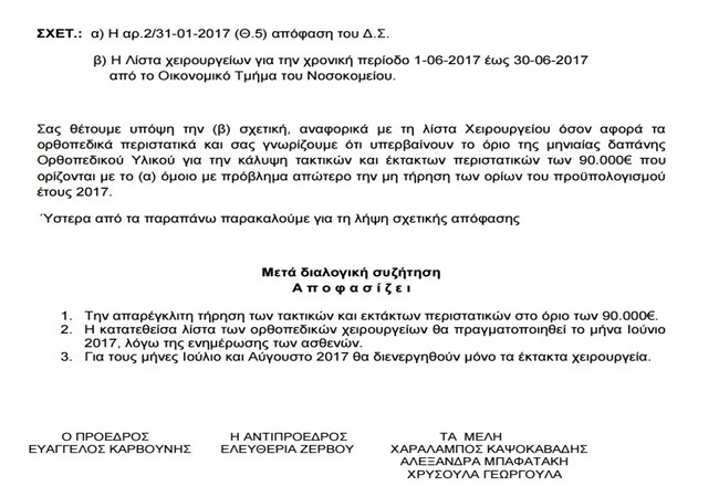 Επίσης η απόφαση του Διοικητικού Συμβουλίου περιλαμβάνει την εντολή για συμμόρφωση των ορθοπεδικών Ιατρών από εδώ και στο εξής στην τήρηση του μπάτζετ των 90.000 για τακτικά και έκτακτα ορθοπεδικά χειρουργικά περιστατικά.